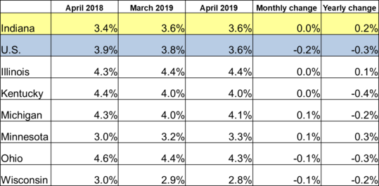 INDIANAPOLIS – Indiana’s unemployment rate remains at 3.6 percent for April, and the national rate also stands at 3.6 percent. The monthly unemployment rate is a U.S. Bureau of Labor Statistics (BLS) indicator that reflects the number of unemployed people seeking employment within the prior four weeks as a percentage of the labor force.